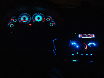 Nun harmonieren Innenraumbeleuchtung, Endstufenlogos und das restliche Interieur in einheilichem Blauton. Über dem Plasmatacho habe ich ein Chromtachoblende angebracht, die nur die relevanten Instrumente sehen lässt. Die Chromblende wird von zwei Rainbow-LEDs angestrahlt, was bei Dunkelheit ein wahrer Augenschmaus ist.